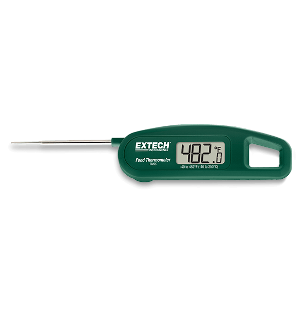The Extech TM55 is a foldable food thermometer that fits in your pocket. This compact thermometer with a 61mm stainless steel probe is NSF certified for measuring liquids, pastes, and semi-solid foods.