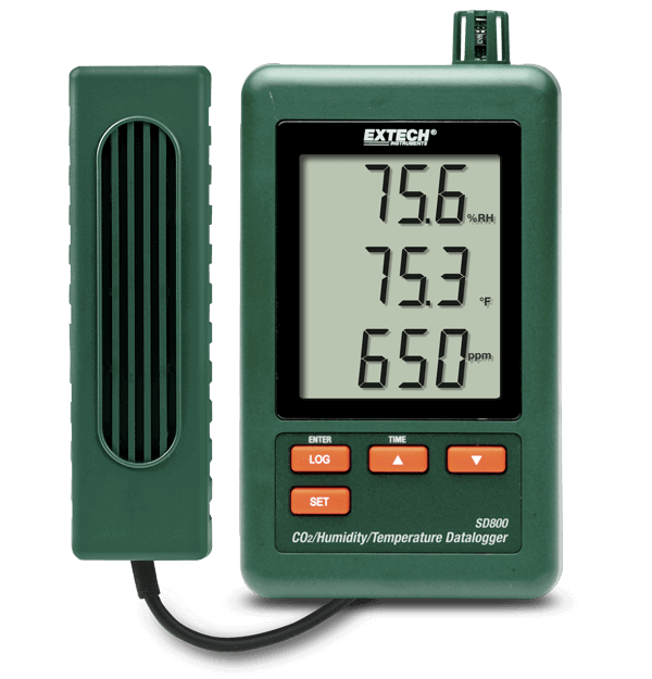 L'Extech SD800 est un enregistreur de données pour le CO2, l'humidité et la température qui vous permet de contrôler la qualité de l'air dans les écoles, les immeubles de bureaux, les hôpitaux et partout où de fortes concentrations de dioxyde de carbone sont produites. L'écran LCD affiche simultanément le CO2, la température et l'humidité relative. La fréquence d'échantillonnage des données peut être réglée sur 5, 10, 30, 60, 120, 300, 600 secondes ou automatiquement. Cet appareil est équipé d'un capteur NDIR CO2. Le SD800 est livré avec une carte mémoire SD 2G, un support de montage, 6 piles AAA et un adaptateur secteur universel.